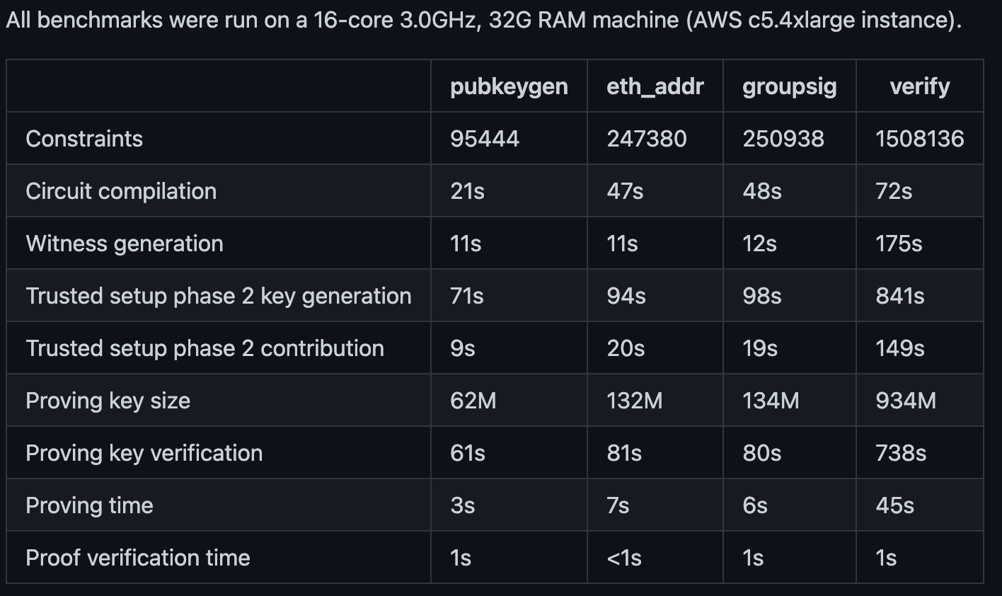 <table><thead><tr><th>Process</th><th width="249">2^18 constraints</th></tr></thead><tbody><tr><td>Verifier key generation</td><td>3.85s</td></tr><tr><td>Prover key generation</td><td>4.47s</td></tr><tr><td>Proof generation</td><td>19.1s</td></tr><tr><td>Verification</td><td>11.1ms</td></tr></tbody></table>