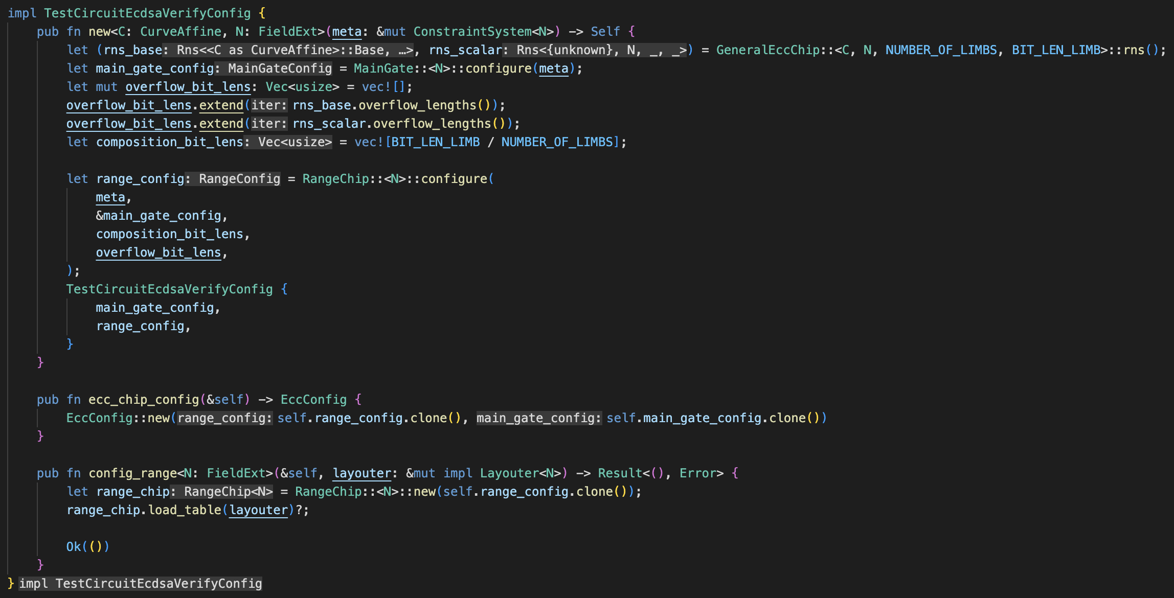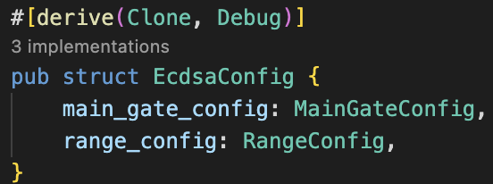 Next we want some implementations for this config. Two of the functions are straightforward, one will return a range chip using the range config, and the other will return an ECC config using both the main and range configs to create it.