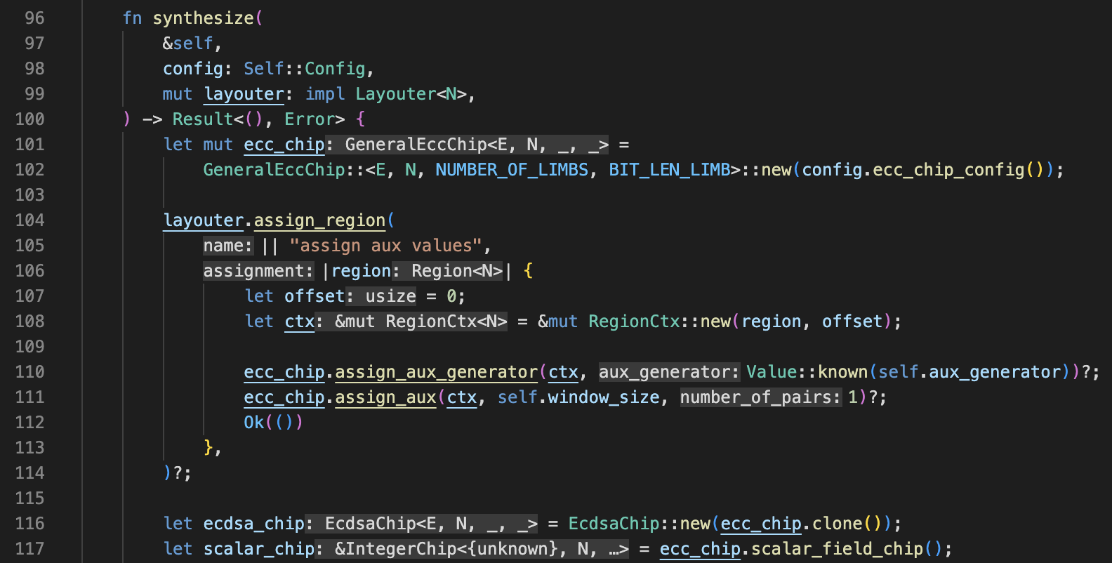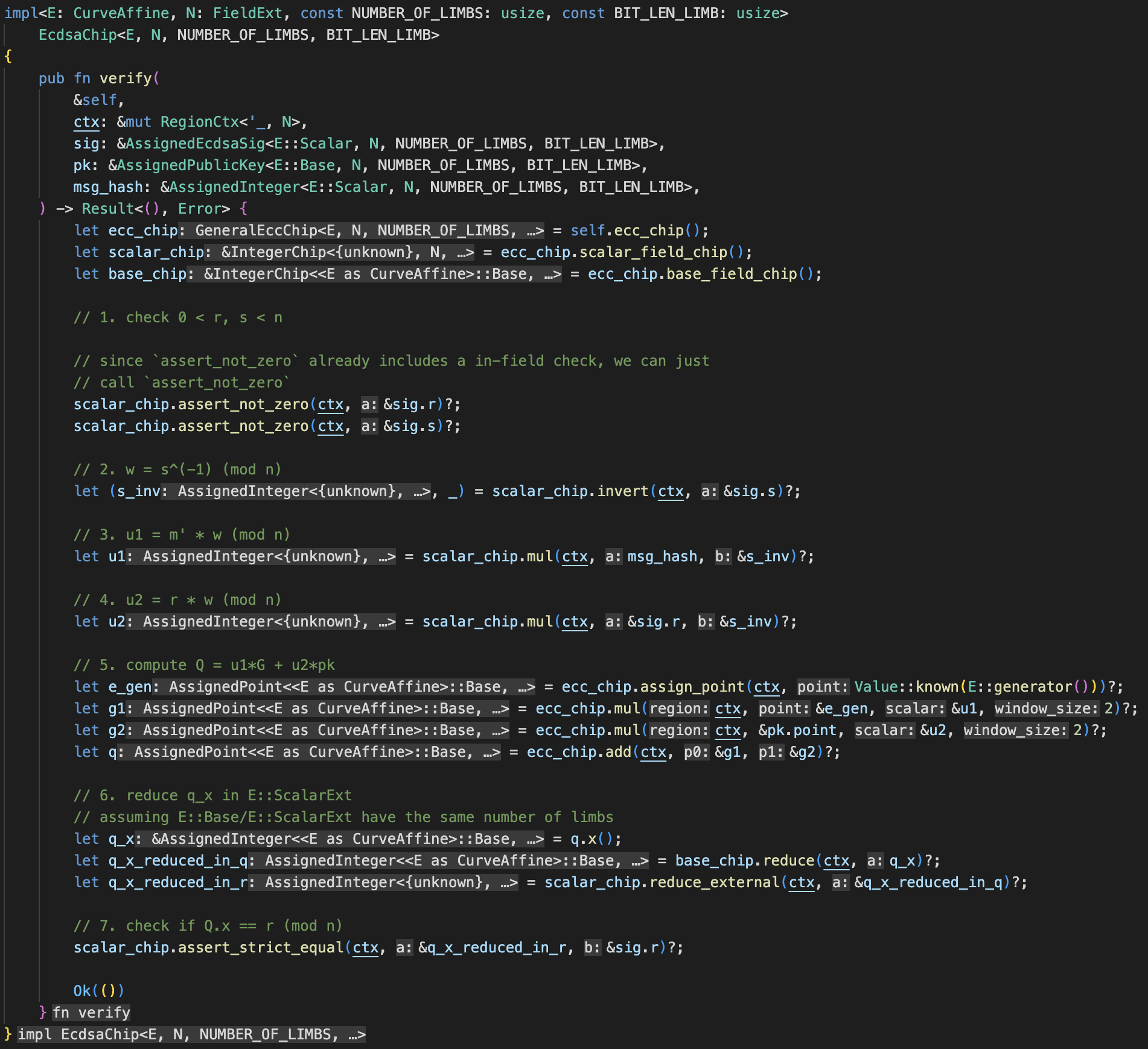 It is time to assign a region to conduct the actual ECDSA algorithm. You can see in the code that most of what happens here is just calling implemented functions on the ECC and scalar chips, and those functions will do the construction for us.&#x20;