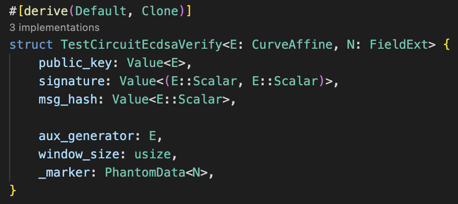 Next up we make the actual circuit that we want. This needs to be able to contain all the data that we need to fill out the rest of the circuit. This of course means it needs the public key, the signature, message hash, and some other data. We could actually remove the public key because we can derive it from the secret key but there is some use in adding it separately.