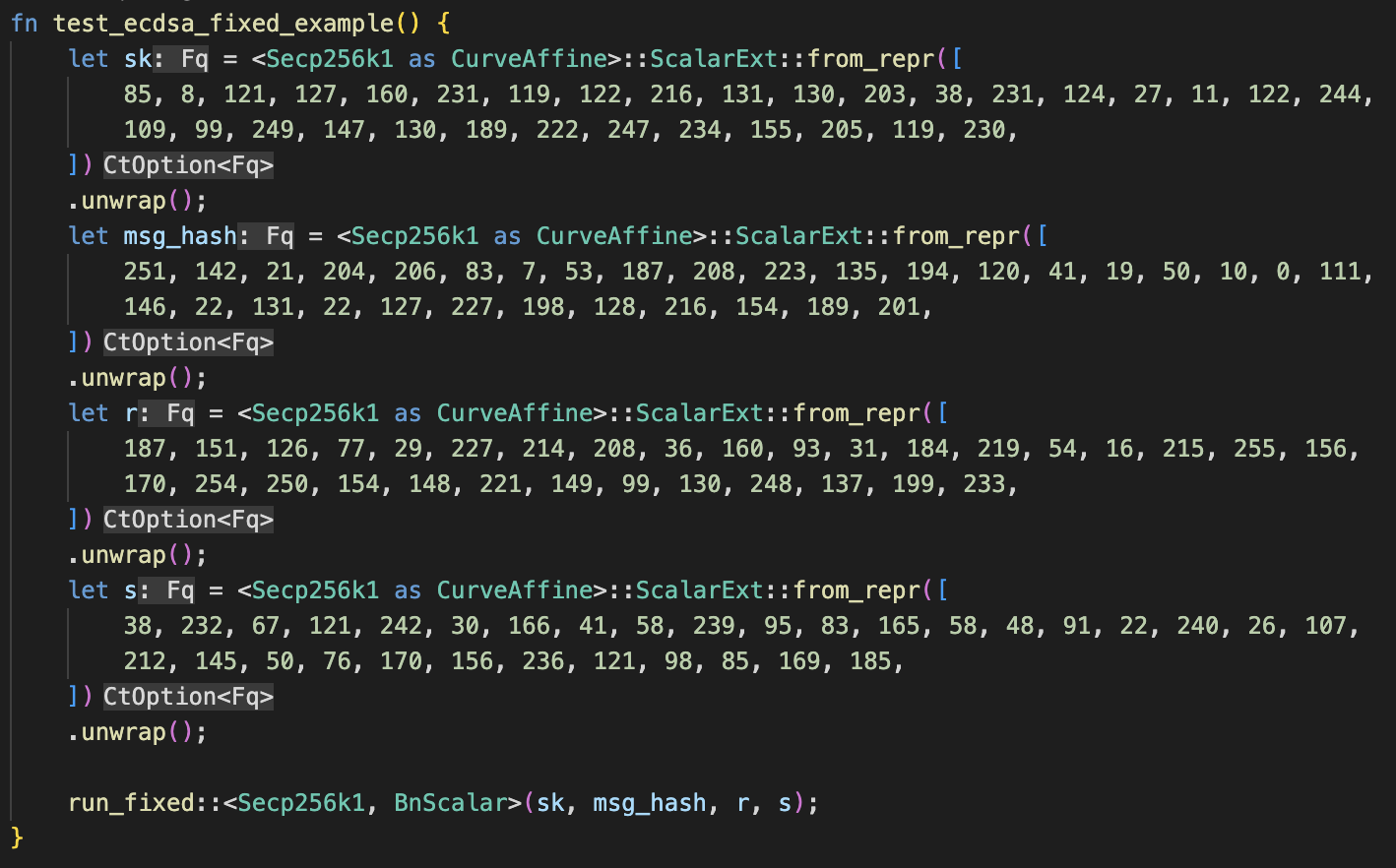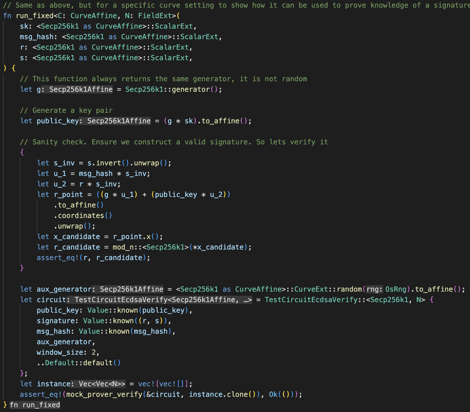 Finally, here is the test that we run. It contains data for a valid signature on a certain public key and message. We insert the data into the run function, and if anything is wrong or incorrect the mock prover/verifier will fail.