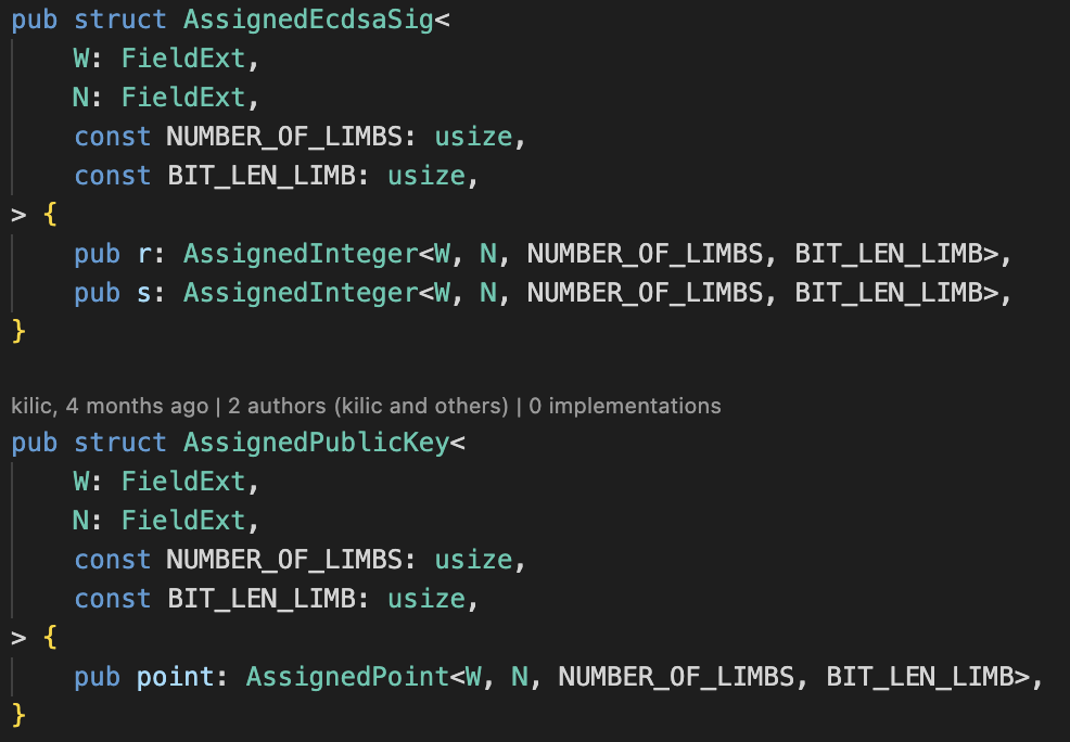 Next we create structs for items we will need along the way in the signature algorithm; these are the signature itself and also the associated public key. The `Assigned` keyword here refers to the fact that these structs contain within them `AssignedCell`s as opposed to just data value.